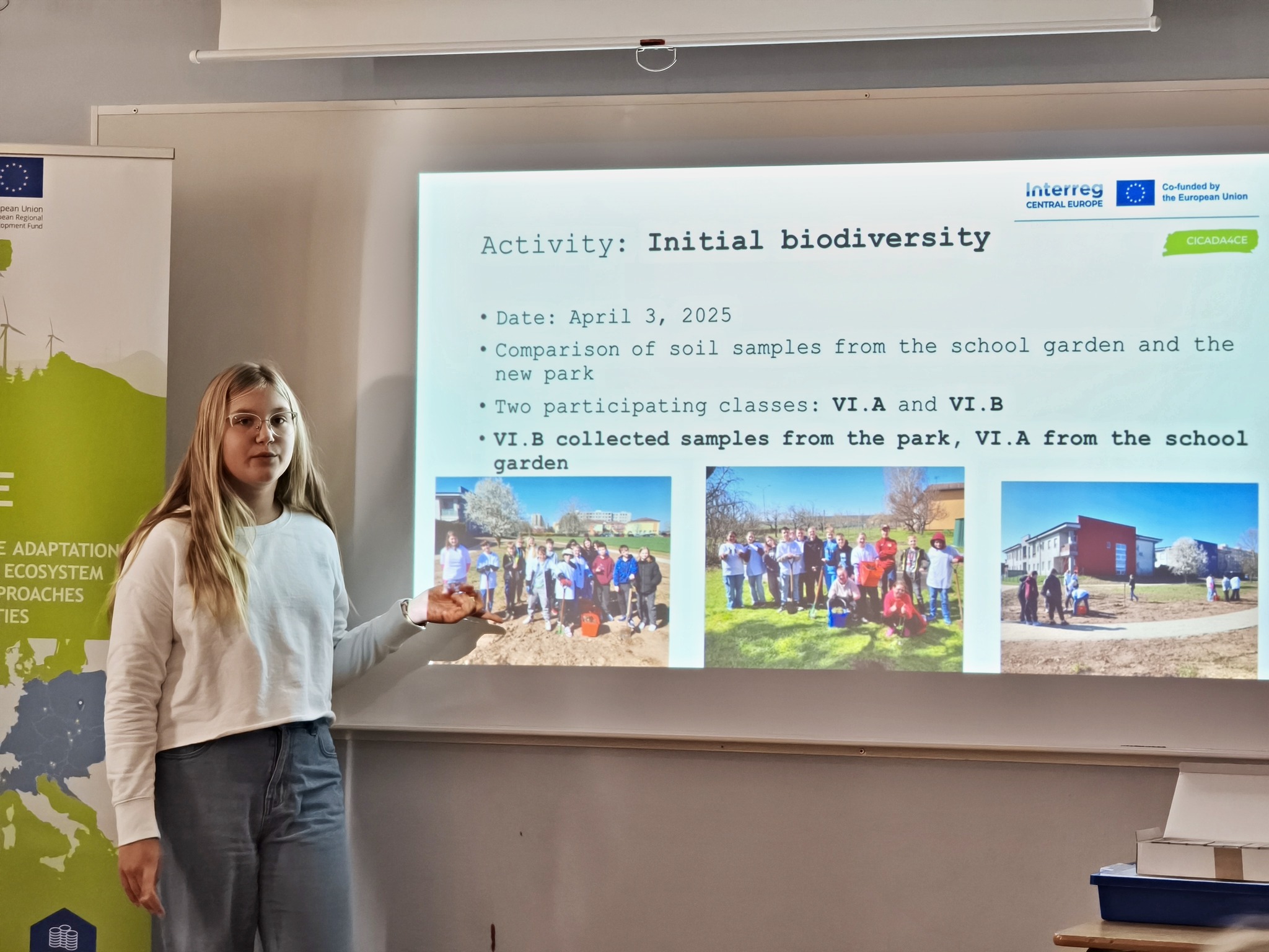 Na půdě školy prezentovaly žákyně Vanesa Čavarová a Sofie Tea Klimovičová výsledky tří měření z oborů přírodopis, chemie a zeměpis. Žáci testovali vzorky půdy, pozorovali vitalitu rostlin a zkoumali, jací živočichové v místě žijí. V další fázi plánujeme zahrnout i fyziku. Projekt našim žákům umožňuje pozorovat, experimentovat a zkoumat v reálném prostředí. Badatelsky orientovaná výuka činí vzdělávání žáků smysluplnějším a inspirativnějším. V nejbližší době nás v parku čeká ještě meteorologický výzkum pomocí digitální meteorologické stanice, měření kvality ovzduší a následné zpracování nových dat. Zanedlouho navážeme na proběhlé aktivity i dalšími pracemi v terénu. Už 25. listopadu v parku proběhne sázení stromů. Těšíme se, až přiložíme ruku k dílu a pozitivně tak ovlivníme kulturní krajinu kolem nás.