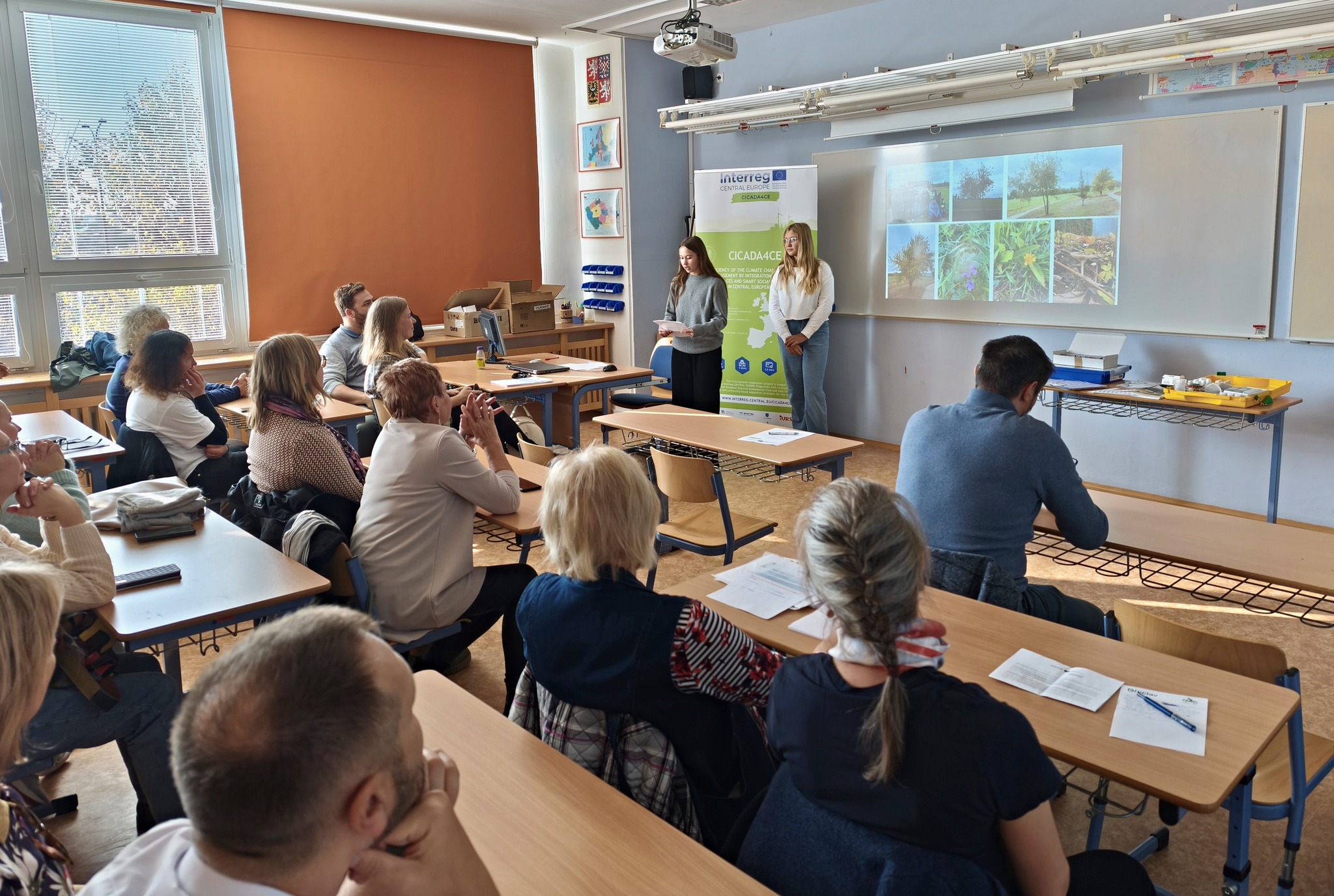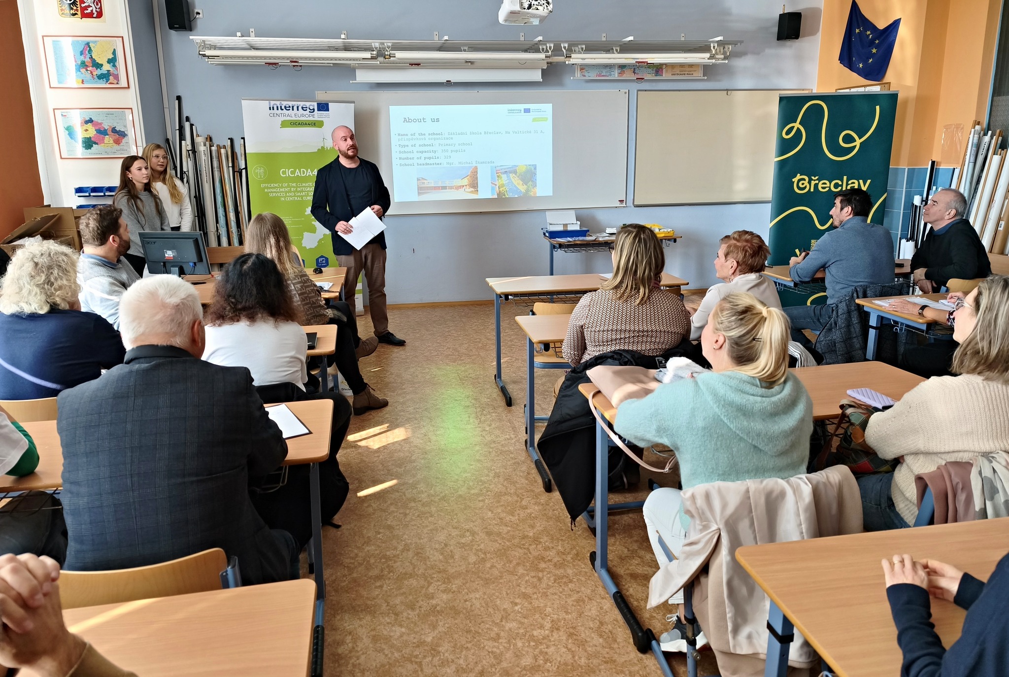 Dne 16. 10. 2025 dorazili do naší školy návštěvníci z Itálie, Slovinska, Slovenska, Polska a Německa, kteří jsou zapojeni do mezinárodního projektu CICADA4CE. Nejdříve si prohlédli vznikající příměstský parčík na sídlišti Na Valtické. Ten je pilotním zeleným projektem, který ukazuje cestu ke snížení tepelného stresu a zlepšení zadržování vody v krajině. Park má sloužit také jako místo pro poučení o klimatické změně a adaptaci na ni.