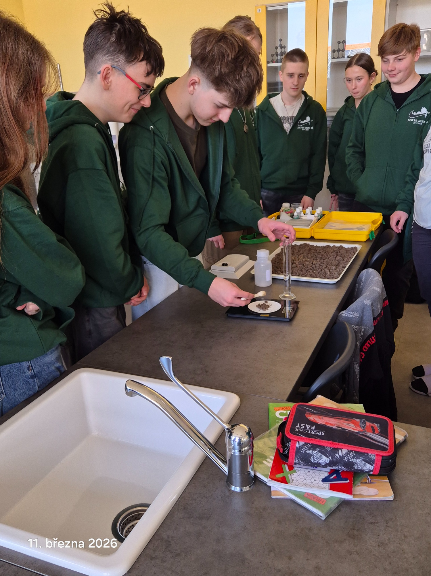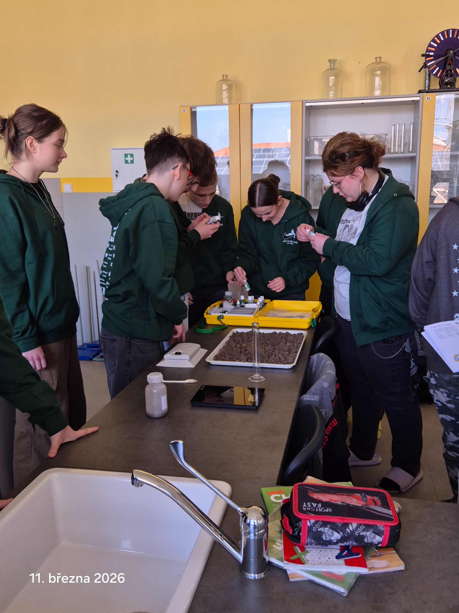 V rámci projektu CICADA4CE pokračují žáci 9. B v měřeních vlastností půdy. Tentokrát se zaměřili na zjišťování pH půdy, která byla do parčíku na Valtické přivezena. Po odběru vzorků a vysušení navezené půdy z různých míst parčíku podrobili vzorky analýze. Po opakovaných měřeních stanovili pH navážky na hodnotu 5, což odpovídá kyselému pH.